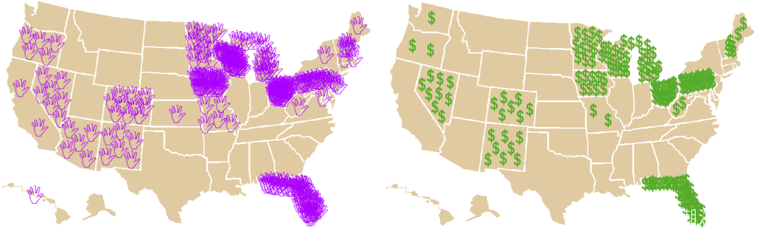 (2004年美國大選時小布什與戈爾在最後衝刺階段關注的重點,一個手掌代表一次訪問,一個美元符號代表一百萬競選資金投入)