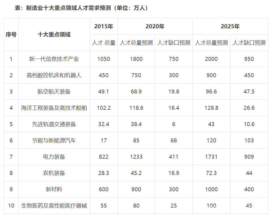 而據人社部、工信部發布的《製造業人才發展規劃指南》顯示:中國製造業10大重點領域2020年的人才缺口超過1900萬人,2025年這個數字或將接近3000萬人,缺口率高達48%。