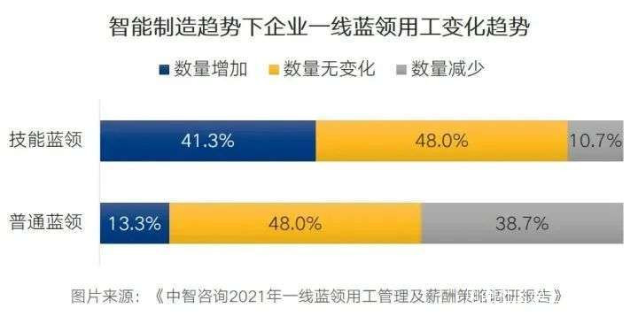 未來有着強經驗、強技術曲線的,並伴隨時間增長有更高的薪酬與職業競爭力的製造業企業,對年輕人的吸引力會愈加明顯。從中智諮詢2021年的調研報告來看,智能製造對技能藍領的用工需求也在大幅增長。
