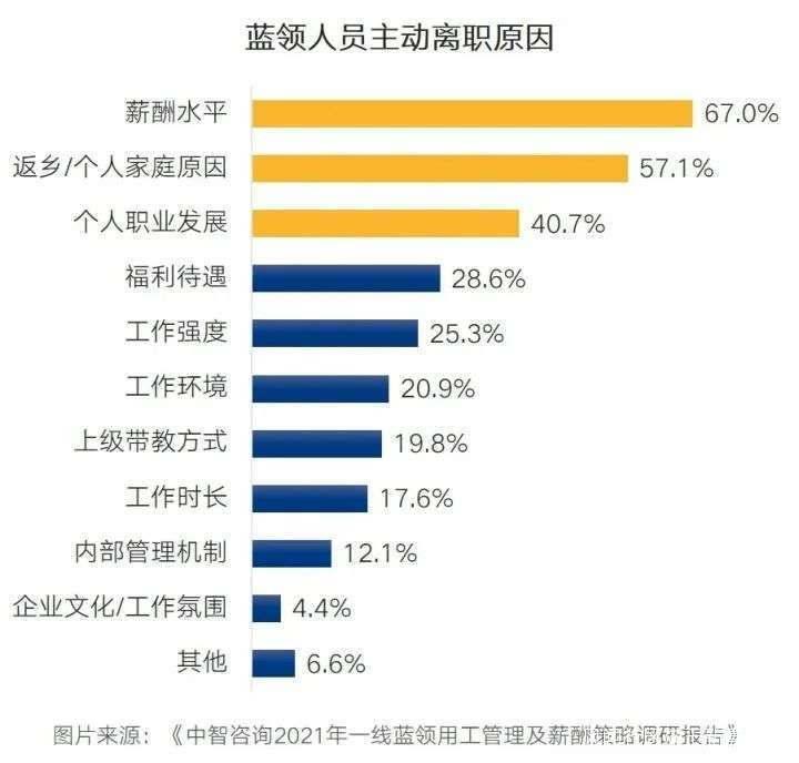 《中智諮詢2021年一線藍領用工管理及薪酬策略調研報告》報告也指出,一線藍領主要離職原因排在前三的分別為薪酬水平、返鄉/個人家庭原因和個人職業發展,其中薪酬水平為首要影響因素,佔比為67%。