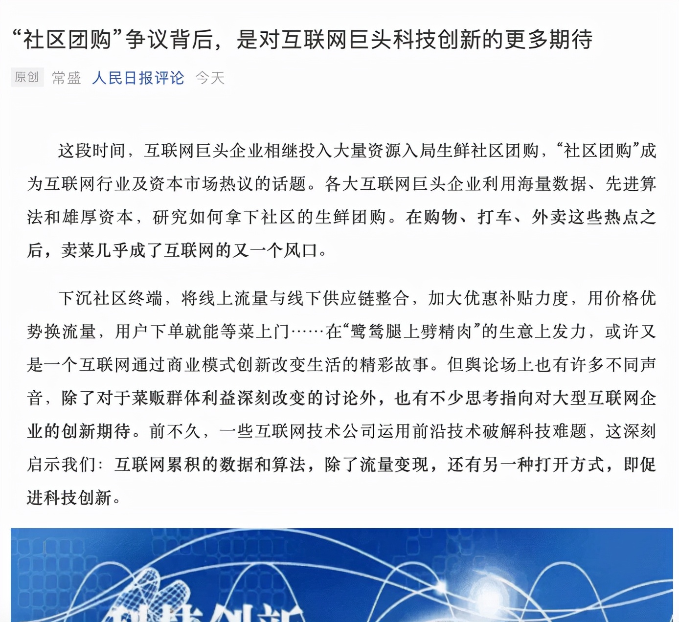 在輿論層面,外界對於互聯網巨頭不斷通過燒錢的方式來侵佔新市場的行為也開始有了質疑之聲,人民日報也對此評論稱**“別隻惦記着幾捆白菜、幾斤水果的流量,科技創新的星辰大海、未來的無限可能性,其實更令人心潮澎湃。”**