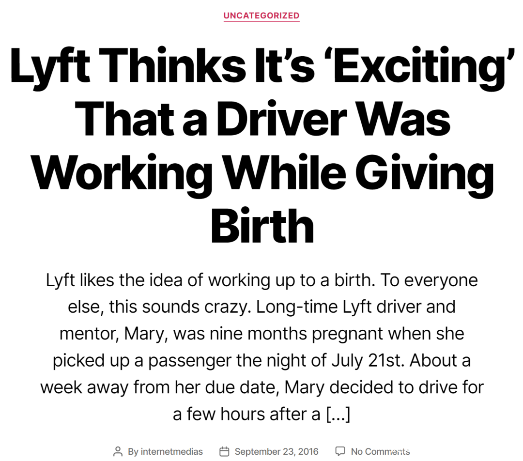 新聞報道截圖:“Lyft 認為司機在分娩時工作‘令人興奮’”