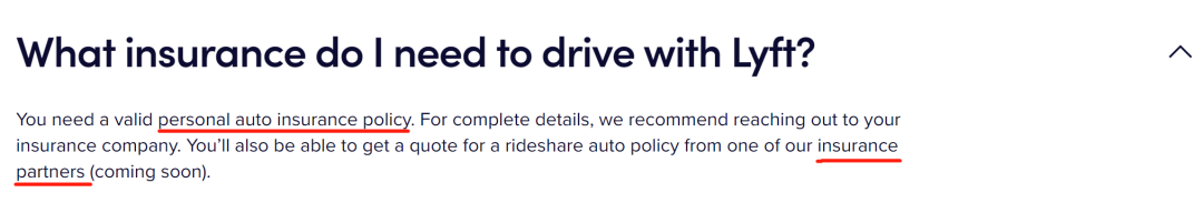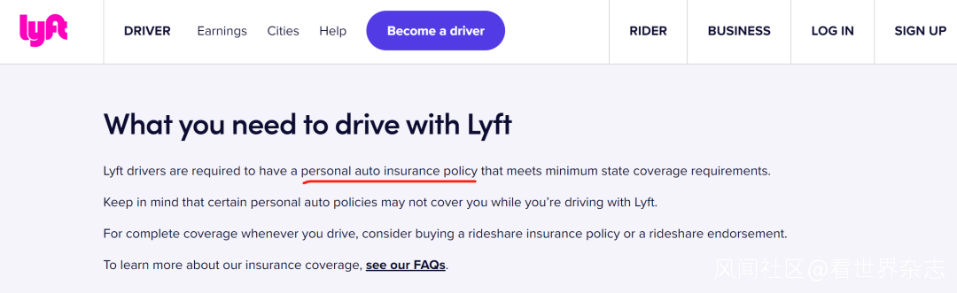 Lyft官網對司機保險的解釋:司機需要有符合州最低保險要求的個人汽車保險單,或者聯繫Lyft的保險合作伙伴。