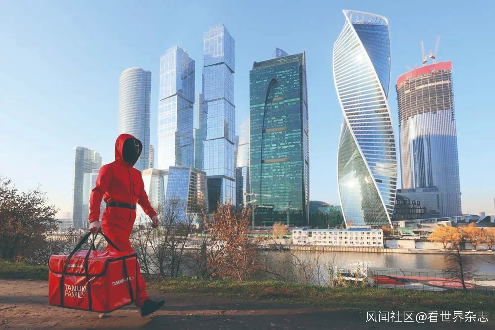 2021年11月,俄羅斯外賣小哥身穿電視劇《魷魚遊戲》裏的服裝送餐