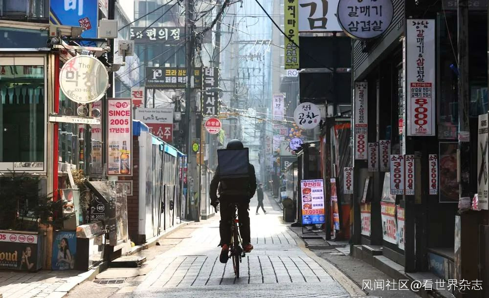 韓國首爾,送餐的外賣員騎車經過首爾江南站附近的飯店
