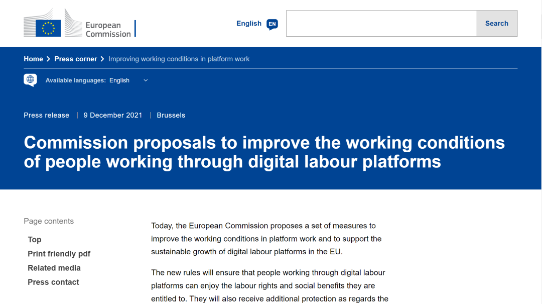 歐盟委員會建議改善通過數字勞工平台工作的人們的工作條件