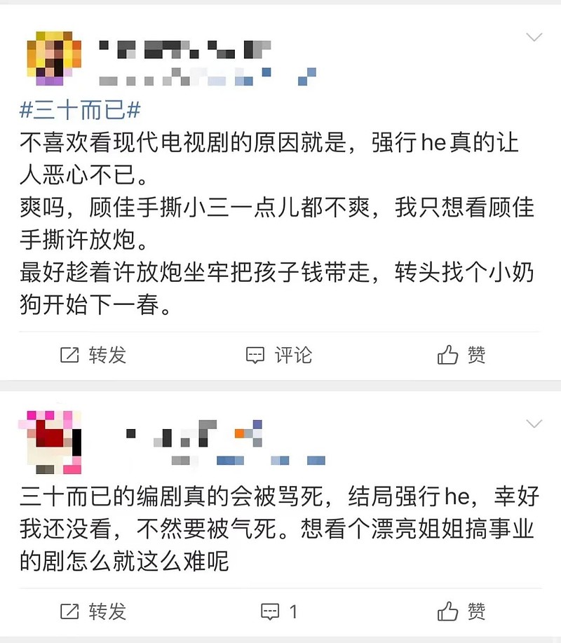 官方給出的HE結局,大部分時候無法滿足所有觀眾,甚至會產生“反作用力”,比如被稱為熱搜劇的《三十而已》、年初剛收官的《完美關係》都被部分觀眾指責為“強行HE”。雖然大部分觀眾都抱有對HE的期待,但劇集創作者需要思考的問題,更像是在劇情邏輯內給出合情合理的結局。