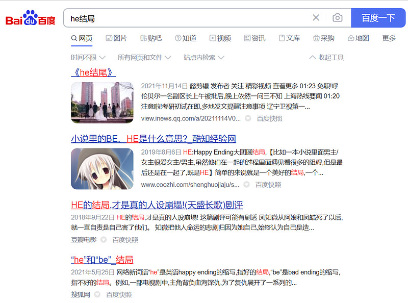2005年左右,這兩個標籤經歷了第一次語義擴張,開始逐漸進入網文範疇。在各類搜索引擎上查詢“HE/BE結局”,80%的結果都與網文有關。知乎上也有大量問題與“求HE/BE推文”相關。