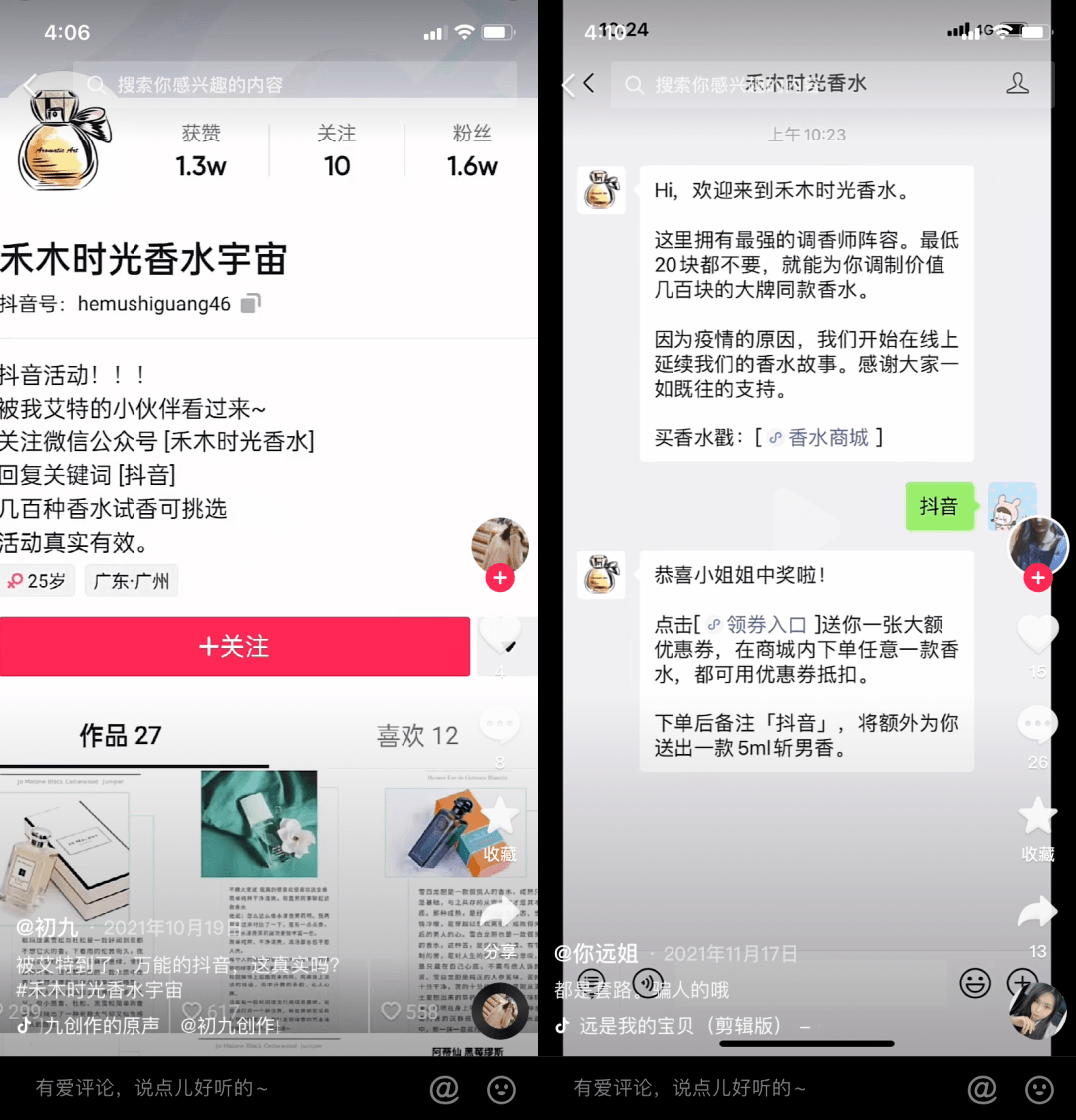 王琳在抖音中連刷2條一樣的護膚品推廣視頻後,接着又被某香水廣告視頻艾特,且廣告內容顯示,王琳及其他被艾特的3人可隨機挑選一款試香,只需微信關注其公眾號“禾木時光香水”並回復“抖音”即可領取。