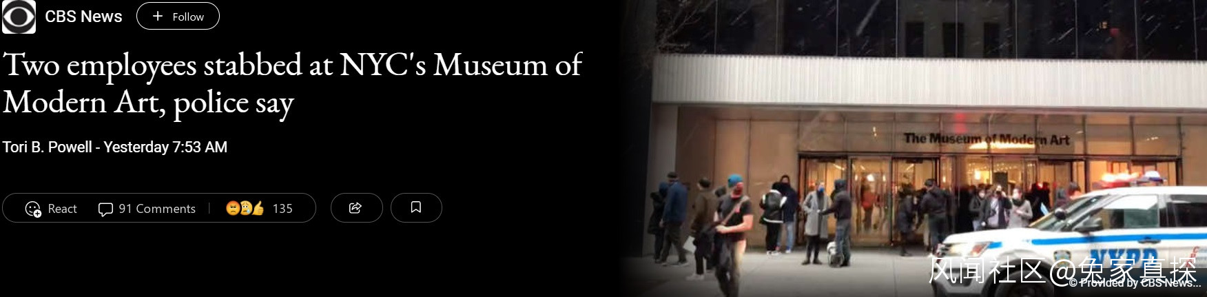 CBS: 警方説,週六,一名男子在紐約市現代藝術博物館刺傷了兩名員工。警方仍在尋找嫌疑人,他被確認為博物館的前成員。