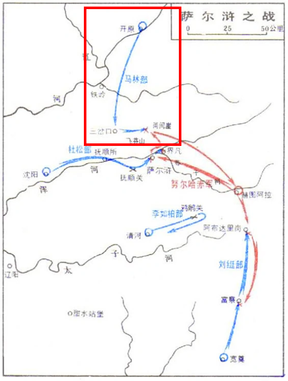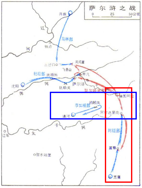 按道路里程來看,顯然南路軍會更快抵達赫圖阿拉,邏輯上應該是先打南路軍為佳。