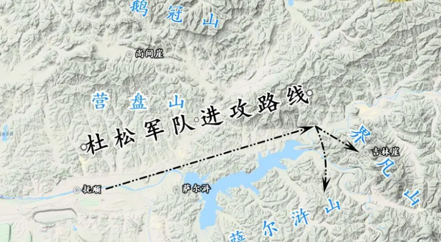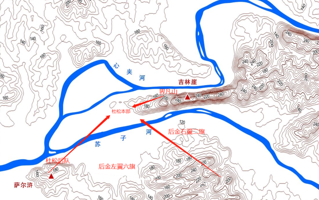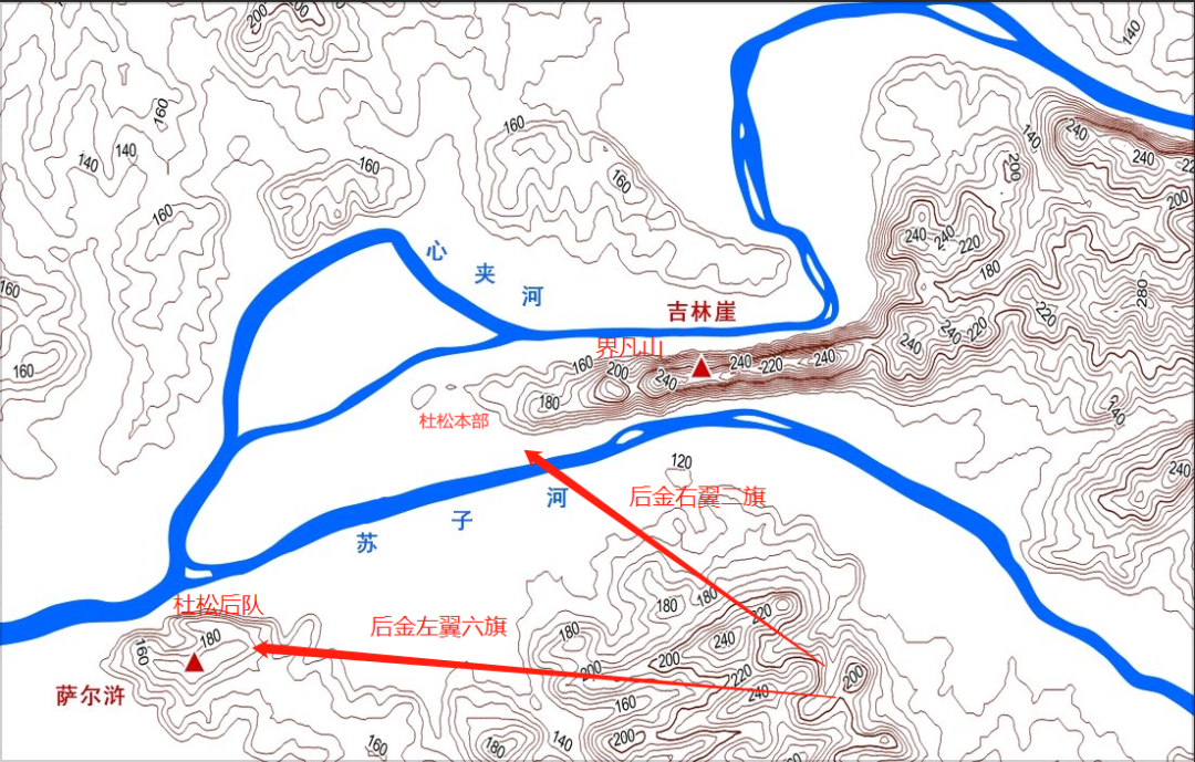 因為界凡山正好處於蘇子河和渾河的夾角處,戰場狹窄,杜松的後隊人馬帶的裝備又多,無法展開,只好在渡過渾河之後在蘇子河西岸的薩爾滸山上紮營,還有一部分輜重部隊,被落在最後面,還沒渡過渾河。