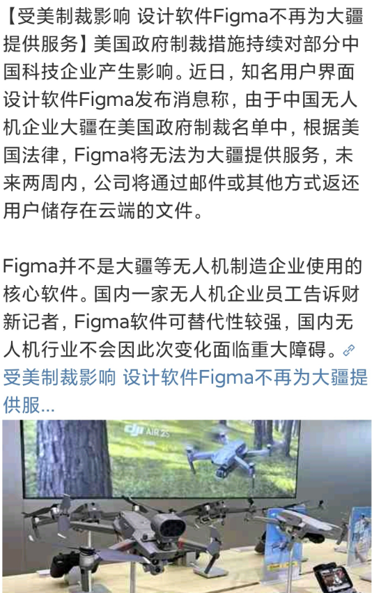 1. 大疆被用户界面設計軟件Figma制裁沒法用了,中國軟件公司大喜出來宣傳,直接兼容文件格式,原Figma用户無感切換。