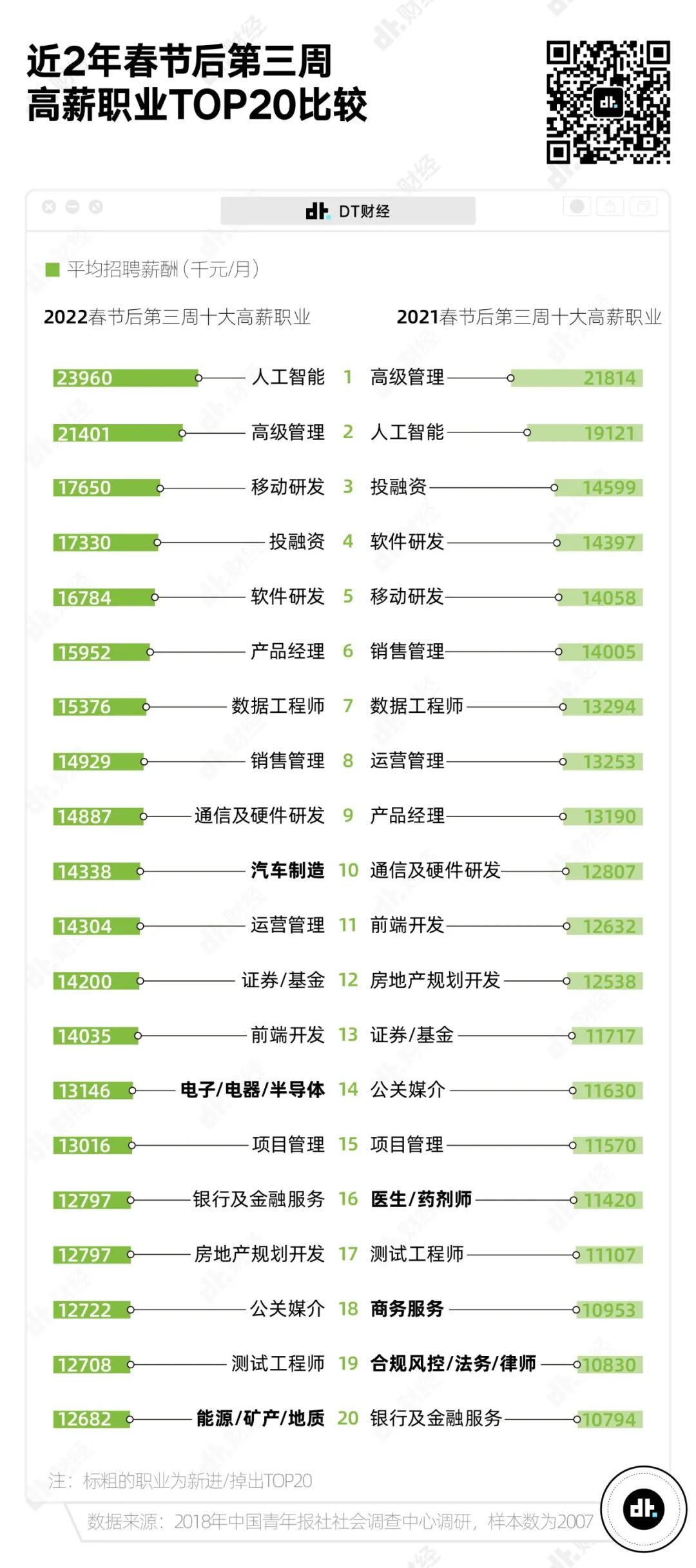 而從職業來看,對比兩年間高薪職業的變化,我們能發現一些市場趨勢。