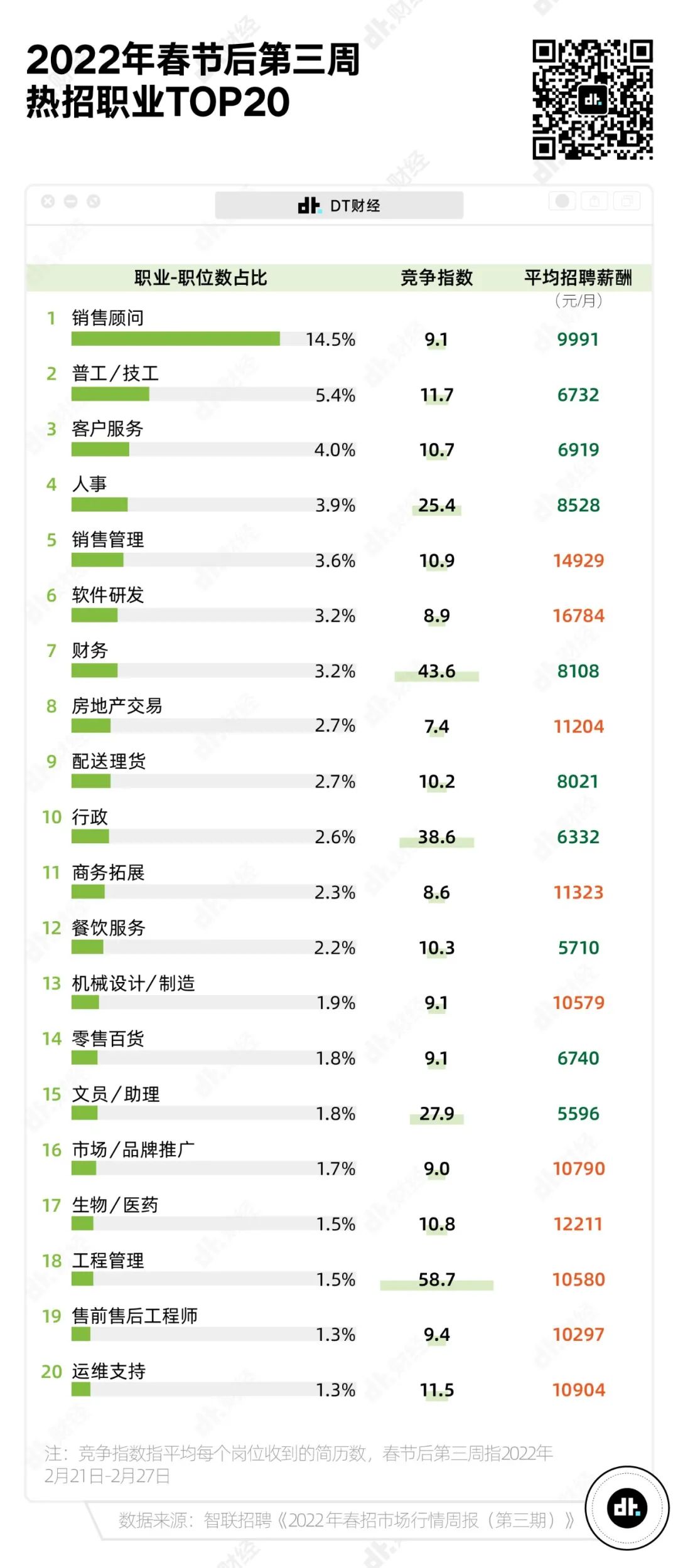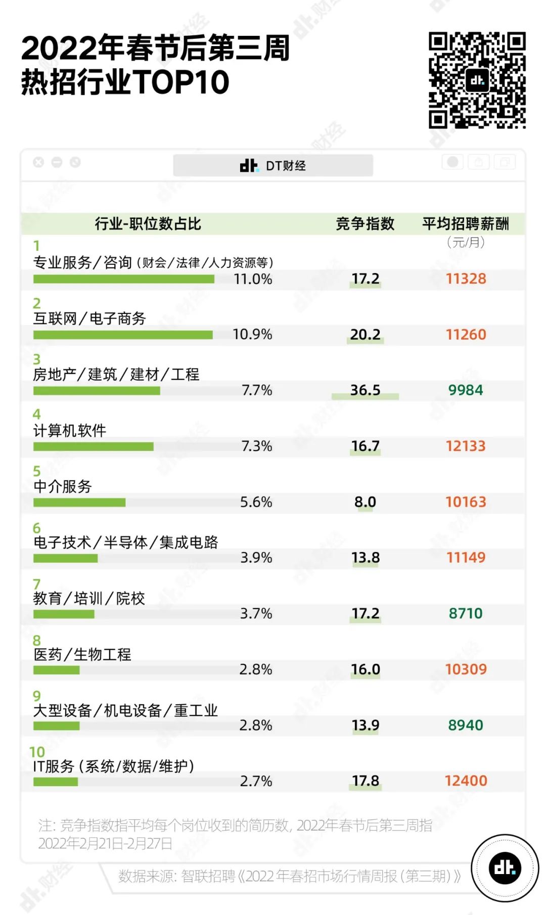 求職從來不是簡單線性的過程。大多數簡歷最終流向興趣、待遇、難度和理想都相對平衡的領域,這些領域便成為熱門。春節過後,智聯招聘發佈了《2022年春招市場行情週報(第三期)》。DT君從中梳理出熱招行業的一些“端倪”。