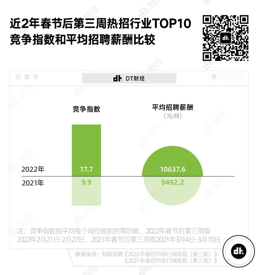 不過,面對幾乎翻番的求職者,企業沒有拉低工資,反而給出了更高薪酬。數據顯示,在平均招聘薪酬上,2022年春招熱門行業平均薪酬約10637.6元/月,高於2021年的9492.2元/月。或許,這就是求職者在“卷王大戰”中能獲得的最大慰藉。