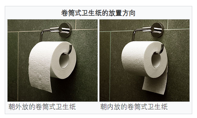 而朝內放的人則認為,將衞生紙的末端隱藏起來會比較整潔,避免了孩子或者寵物把一整捲紙拉散。