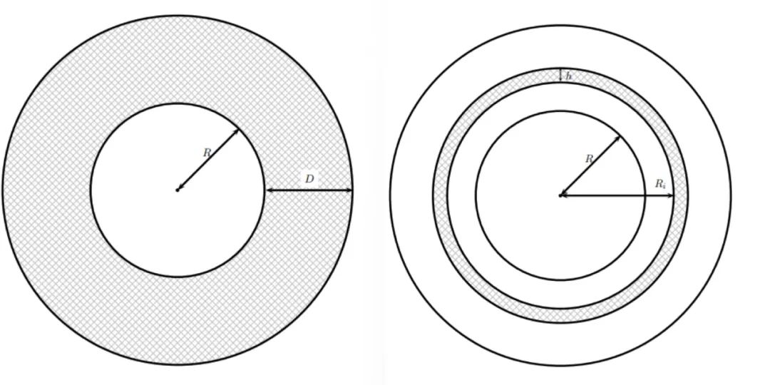 從最基礎的開始算起,我們可以將衞生紙看作一個半徑為R的紙筒,上面一共纏了n層紙,就可以看成是套了n層圓環。紙的總厚度為D。而一張紙的厚度為h。
