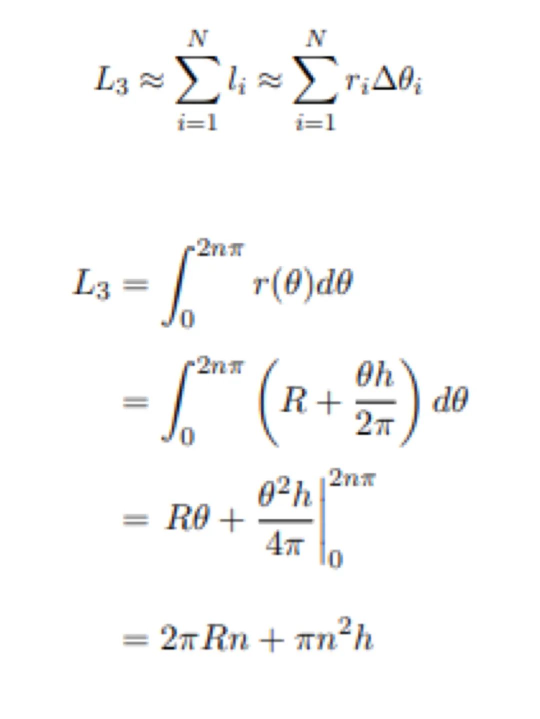 不過,紙卷的情況要比這個更復雜,因為紙不斷纏繞的時候,圓環的半徑也在不斷增加。與其把它看成是一層一層的圓環,還不如直接看成一個螺旋,通過旋轉的角度來計算螺旋的總長度。然後再把紙巾轉過的所有角度都加起來就好了。