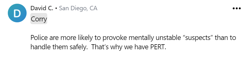 PERT的存在是為了在警員沒有準備好安全和有效地處理患有精神疾病的嫌犯的情況下進行干預。詢問警方是否願意調用PERT,並不是在玩命。