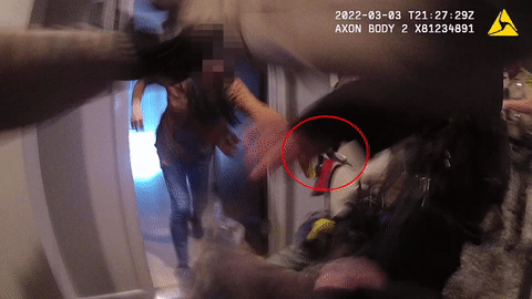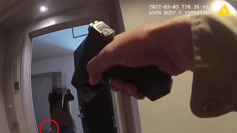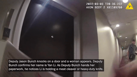 當警員們命令她舉起雙手出來時,Li在卧室門後,視頻中可以聽到狗的叫聲。Li喊話,並仍然拿着刀,有人喊了兩聲 “bean bag(豆裝散彈槍)",然後聽到武器發射的聲音。