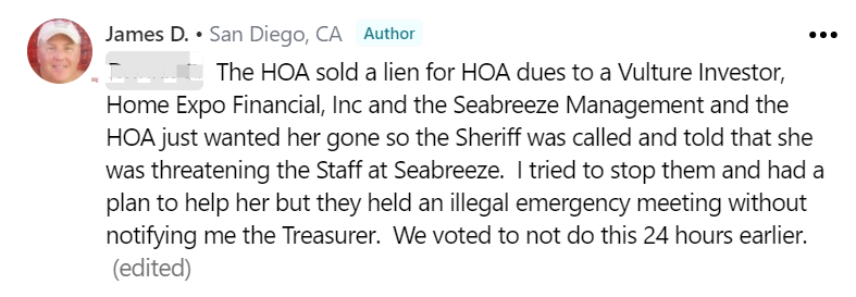 本來我們已經投票決定不出售留置權。但HOA的律師和S管理公司的經理説服HOA主席召開非法緊急會議,在沒有通知我這個投票成員的情況下,他們投票決定以32,000美元的價格出售債務留置權,賣給投資公司。