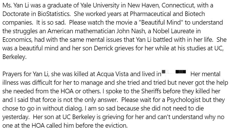 3月3日,47歲的華裔女子Li Yan在聖地亞哥公寓,被前來送驅逐通知的警員亂槍射殺。事後,鄰居稱Yan是耶魯畢業的華裔女博士,生前從事生物統計領域方面的工作。有一個孩子,正在伯克利加大讀書。