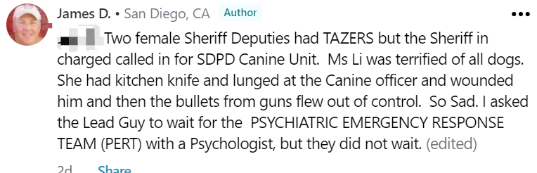 大約8分鐘後,視頻重新開始,Bunch的主管來到現場,可以聽到Li在緊閉的門後大喊。然後又過了40分鐘,副警長和聖地亞哥警察帶着狗準備進入李的房子。