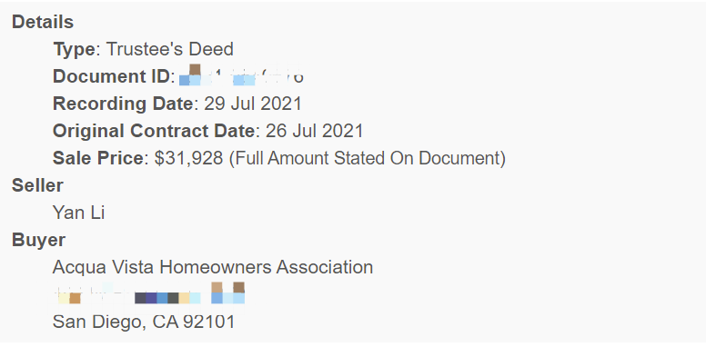 Li Yan被驅逐,是因為欠了HOA$31928物業費,根據美國法律,如果房主欠債太多,HOA可以去法庭,法庭可以拍賣房子。賣的錢還債,剩下的給房主。