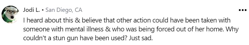 警察應該保護和服務平民,包括在可能的範圍內保護和服務精神病人。驅逐不是一種危機情況。一旦發現精神不穩定,警察可以等待心理醫生到來援助。