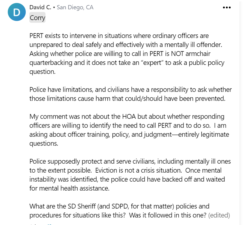 我的評論不是關於HOA,而是關於接警員是否願意識別出需要呼叫PERT並這樣做。我問的是警員的培訓、政策和判斷--完全是合理的問題。