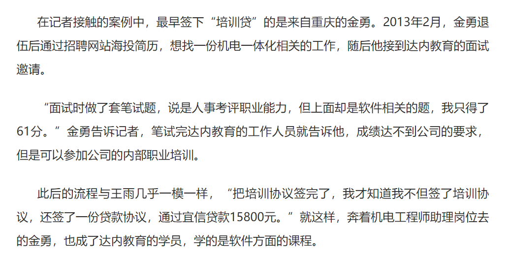 2019年,《證券時報》就曾報道過,2013年,號稱億元級職業教育集團達內教育(下稱“達內”)利用消費貸款模式對應屆生進行職業教育培訓,次年,達內教育就在美國納斯達克上市。