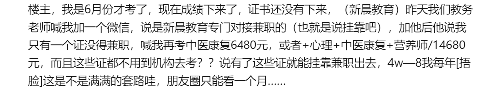不僅如此,她所報名的營養師課程也是相同結局,她依然沒有參與營養師資格證考試的資格,只獲得了機構辦法的技能培訓證書。