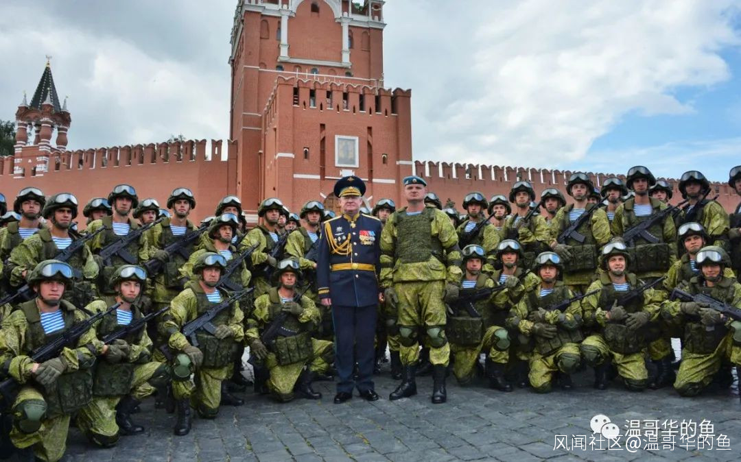 > 2020年傘兵節在紅場“救世主塔”前合影的傘兵,居中穿軍禮服的就是司令員謝爾久科夫上將