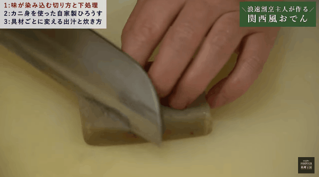真正的關東煮絕對不是煮半成品那麼簡單,不僅很多都需要手工製作,一些看似很天然只需切分的食材,也是需要經過預處理才能達到最佳的口感。