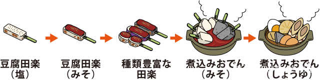 到了江户時代,醬油釀造技術從關西傳到了關東,所以在關東地區,田樂進一步演變成用醬油、柴魚片、味淋等調料調製的湯汁中放入串好的食材煮制的料理。