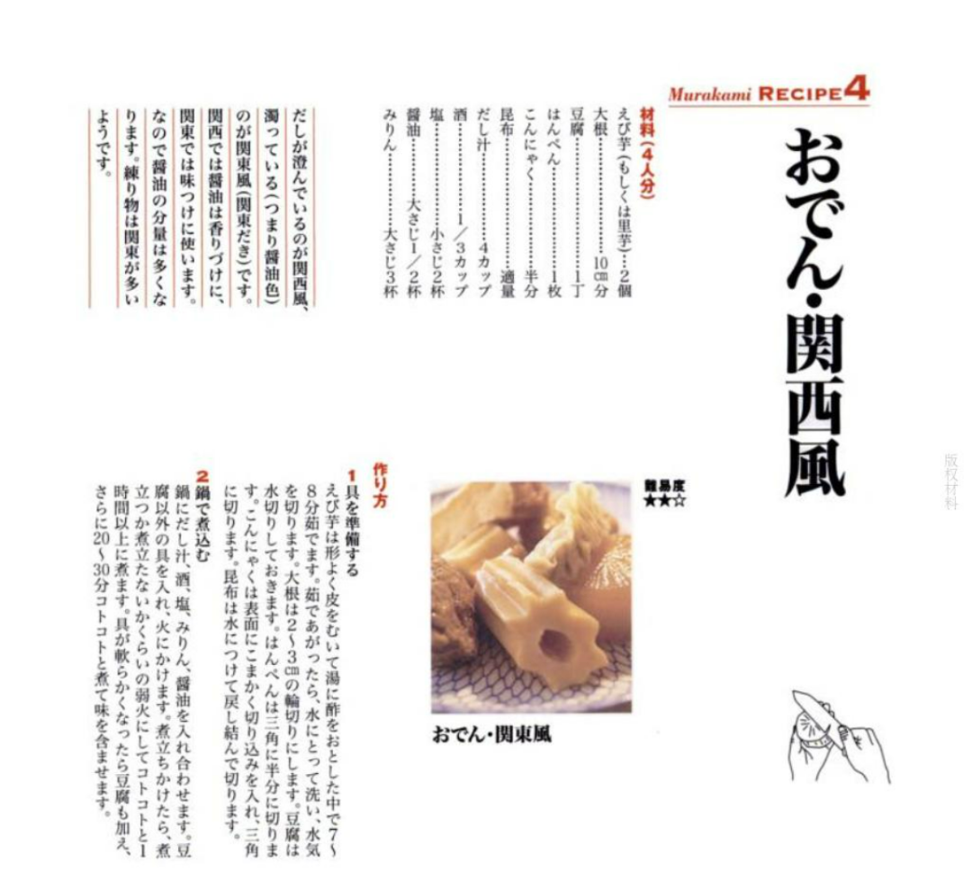 日本知名諾貝爾陪跑作家村上春樹是關西人,有一本關於他的料理書裏介紹過,“湯汁清澈的是關西風,湯汁渾濁(也就是醬油色)的是關東風(關東煮), 在關西,醬油只是用來增香,而在關東,醬油是用來調味,所以使用醬油的分量會更多。”