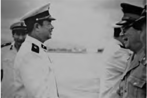 時任國防部長的遲浩田在南沙海戰後接見了陳偉文(左)