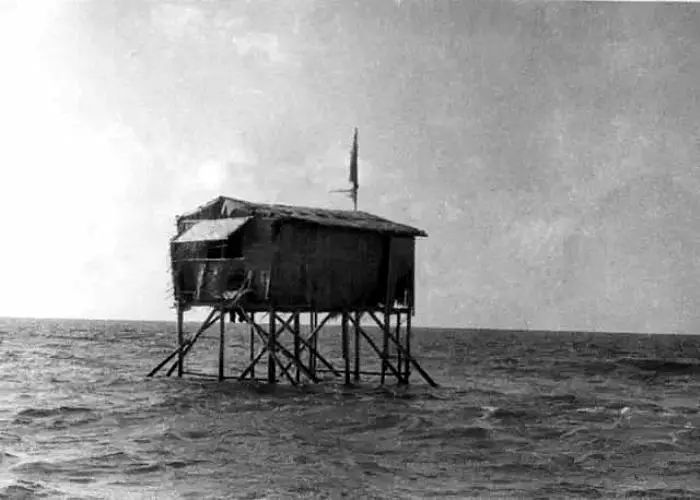 在南沙羣島島礁上建成的第一代“高腳屋”,以鋼釺為依託,竹竿作柱、篾席為牆,瀝青封頂。高腳屋中沒有電燈電話,海上補給能力有限,官兵們很少能吃到新鮮蔬菜、食品,條件非常艱苦,官兵們形象地稱之為“海上貓耳洞”。