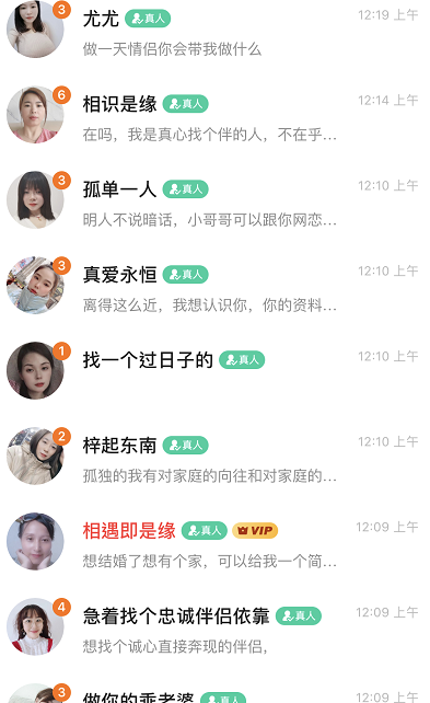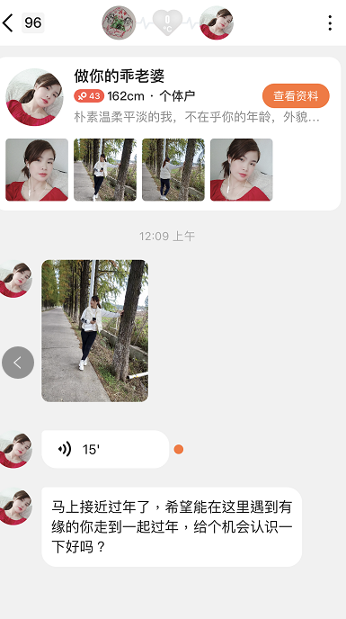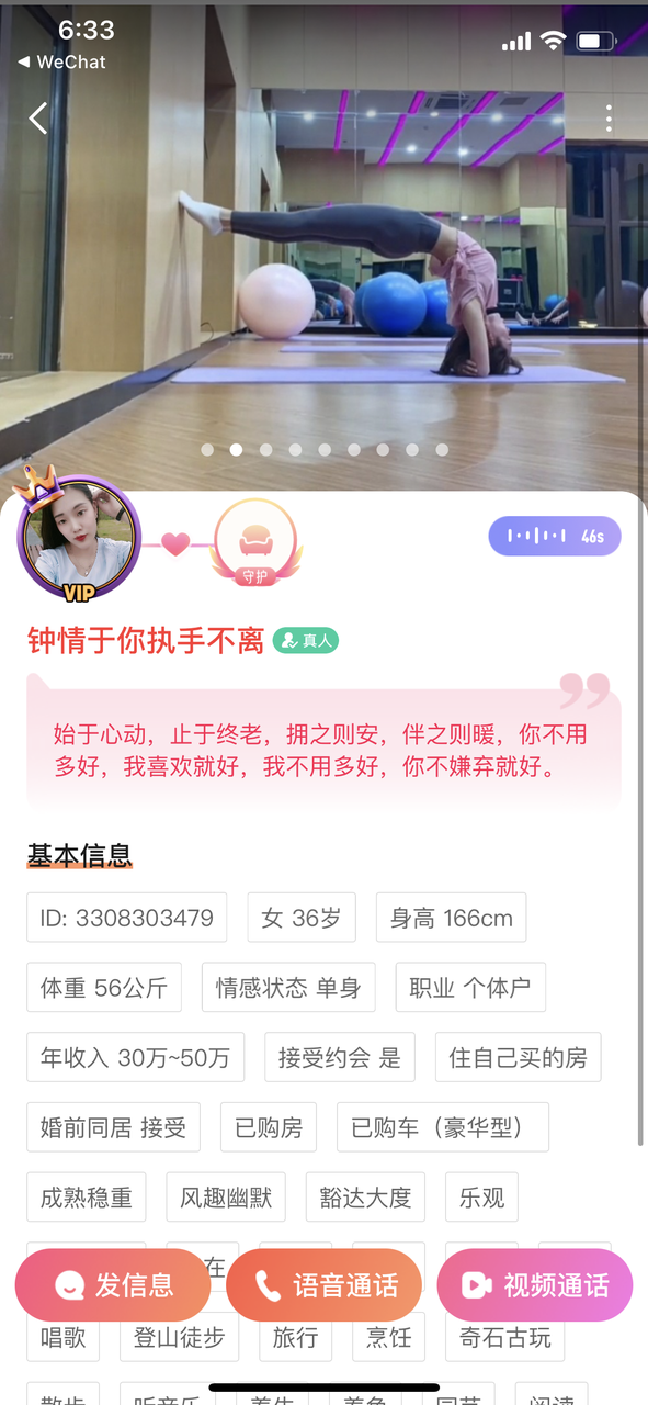 在私聊過程中,我發現其中只有將近1/10的女性帶有VIP認證,她們的資料通常都會比較豐富,有語音、視頻、大量生活照等等,這些用户雖然一部分來自於上面所提到的“專業團隊運營的人設賬號”,但姑且背後確實有真人活動的參與。