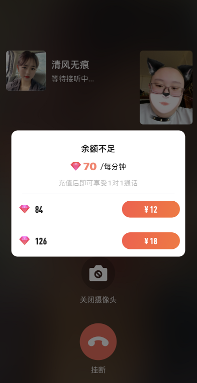 但想到對面的姐姐如此優秀,所以我立刻選擇了充值頁面,但看到鑽石充值12元84個,姐姐和我視頻一分鐘就要70鑽,1小時就需要600元時,我不禁陷入了沉默。
