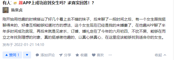 “去年搭訕了幾個看起來不錯的妹子,現在女生已經是我的未婚妻了”;“軟件交友很靠譜,已經見過父母,要領證了”。
