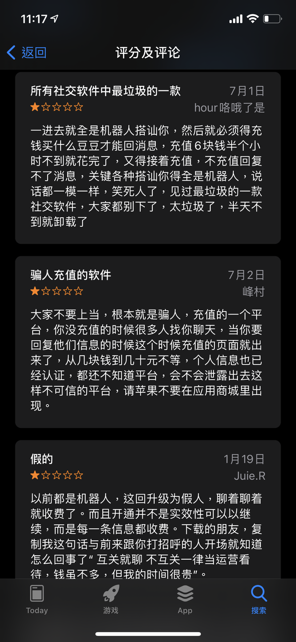 開頭提到的那些在APP商店裏的差評,也基本上都集中吐槽這種機器人,”充值了6塊錢不到半小時就全花完了,關鍵各種搭訕全部都是機器人,説的話全部都一模一樣,笑死人了,垃圾詐騙軟件,大家千萬別下載“。
