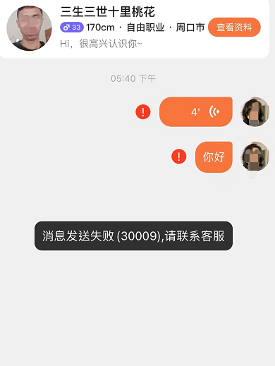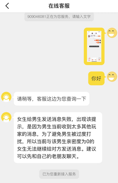 本以為自己是不是哪步認證流程出了問題,結果問了客服,驚訝發現原因居然是:“女生給男生髮送消息失敗,出現該提示,是因為男生當前被過度打擾,所以當前與該男生親密度為0的女生無法發送消息。”