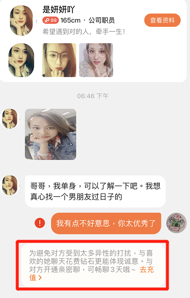 為了避免這些優秀的姐姐們受到太多異性打擾,平台專門為她們設置了一些誠意門檻,我需要花費鑽石,才能給她們發送消息。