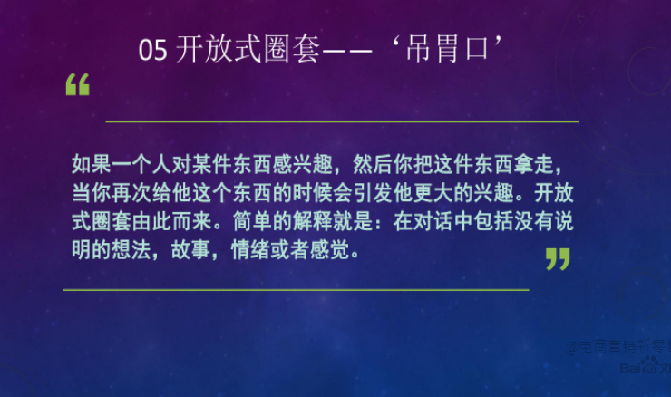 比如套路E,就是教你一旦發現對方對話題感興趣時,就轉移對話內容,等他再次主動向你提問時,就會因為被吊胃口,而產生更多興趣。
