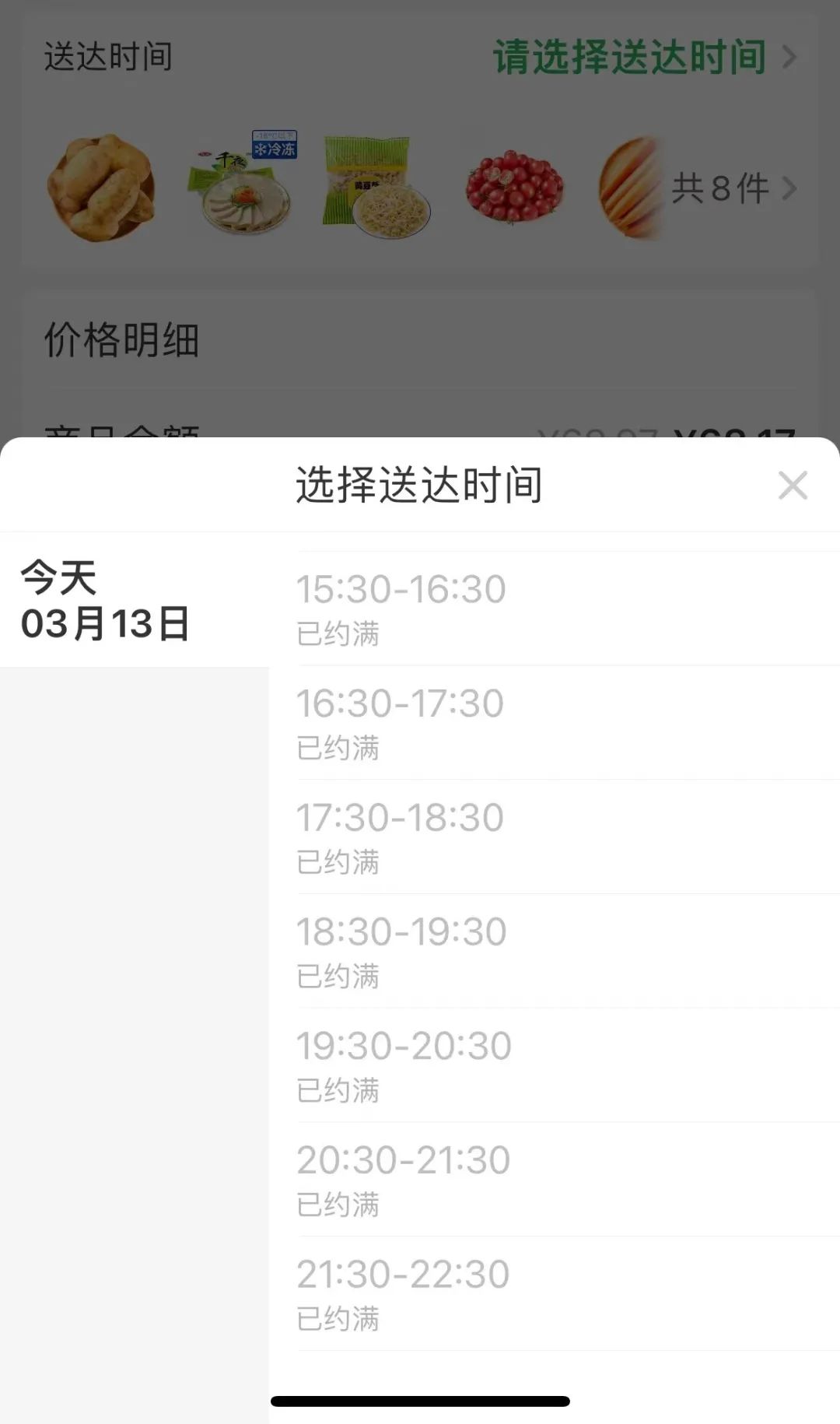 3月12日,記者早上8點多再打開叮咚買菜時,當天的配送時間已經全部約滿,用户只能選擇第二天的配送時間,並且如果選擇一些標識為“僅當日配送”的菜品,則無法選擇配送時間。3月13日,運力情況更加嚴峻,不光當天配送時間約滿,系統也沒有再開放第二天的配送預約了。