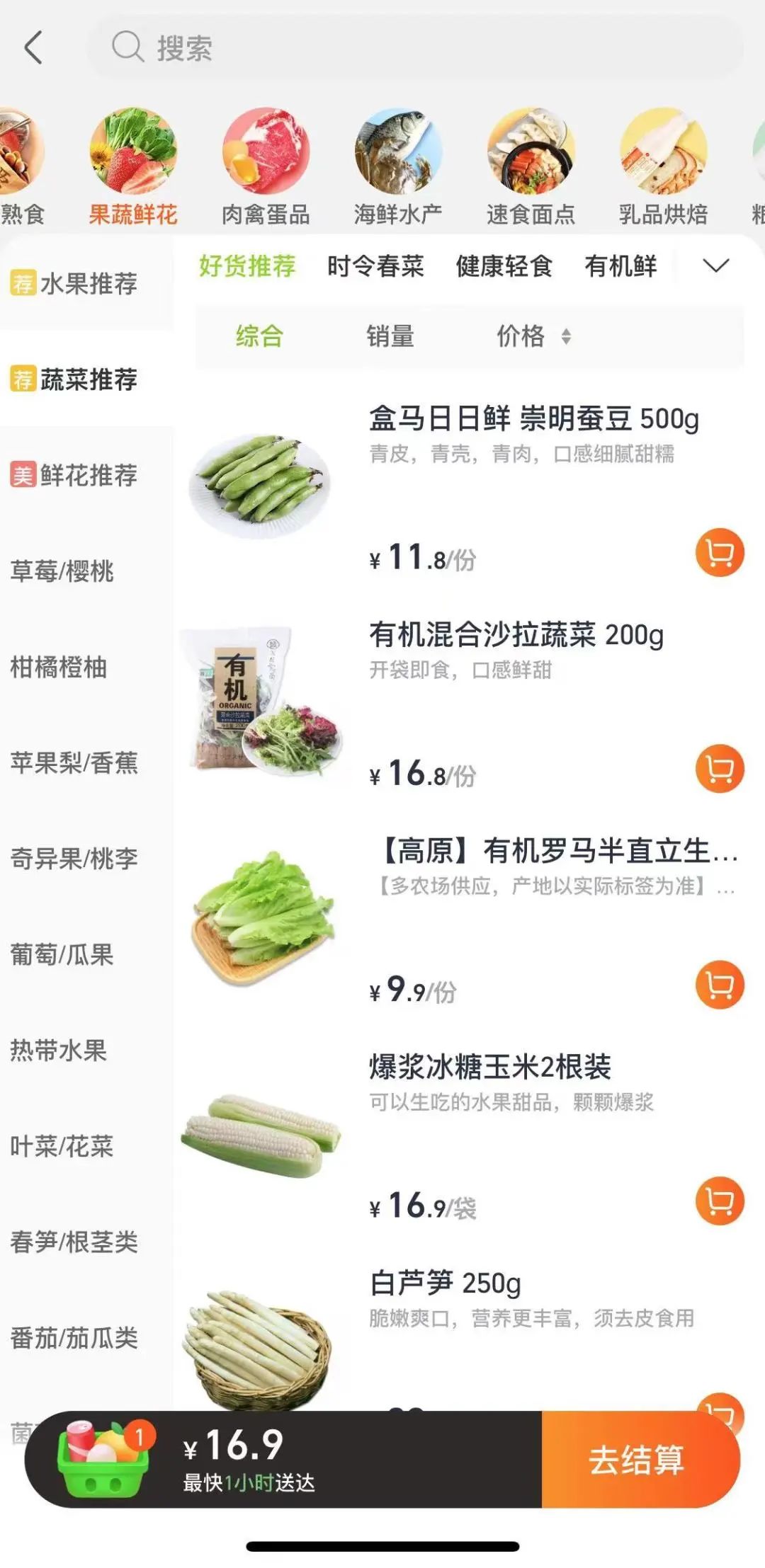 記者打開淘鮮達,所在位置有大潤發、盒馬和天貓半日達三個線上供應點。因為當地疫情防控要求,大潤發和天貓半日達暫時不能下單。打開盒馬,無論是蘋果、香蕉、大白菜、番茄等果蔬,還是魚蝦、豬肉、牛肉等肉禽海鮮,亦或者滷味熟食、蛋糕麪包等都顯示有貨,並且種類豐富,也未出現限購的情況下,用户可以自行下單。
