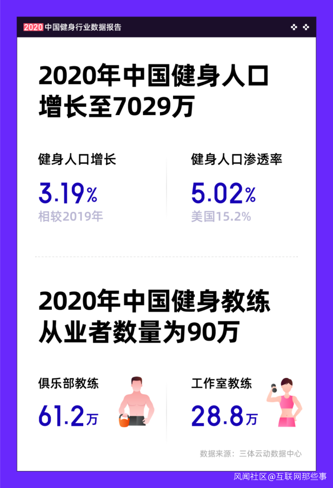 中國整個健身行業的健身會員數約為7029萬(不含港澳台),在14億的總人口基數下,中國的健身人口滲透率為5.02%,環比去年增幅3.19%,從趨勢來看,中國同美國、歐洲的差距在逐漸縮小。