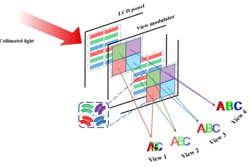 具體來看,研究人員通過將納米結構以聚焦光線的方式圖案化在一個平面上精心設計出一個新的衍射式平面透鏡。**將這些透鏡中的幾個交織在一起,使他們能創造出一個像素化的視圖調製器,這是一種在光場顯示中為場景創造各種視角的光學組件。**比如,一個創建四個視角的3D顯示器將使用四個這樣的鏡頭,每個鏡頭都將光線匯聚成一個獨特的視角。